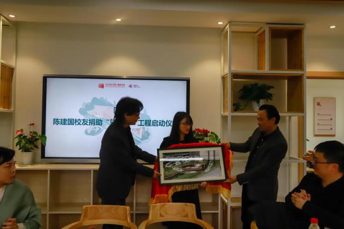 为公共景观“筑梦园”工程揭牌,代表在校师生感谢陈建国校友。