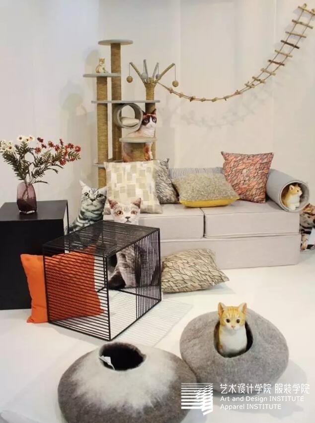 第二个是一个羊毛毡的猫窝,设计灵感来自于宫崎骏的漫画《猫的报恩》,在这部动画里猫拥有自己的王国,像人一样生活,有自己的思想和情趣。围绕猫咪的需求展开,致力于满足猫咪攀爬、跳跃的活动需求以及寻求隐蔽空间的安全感需求,为爱猫人士解决部分养猫的困扰,增添生活的乐趣,营造温馨、有趣的生活环境。
