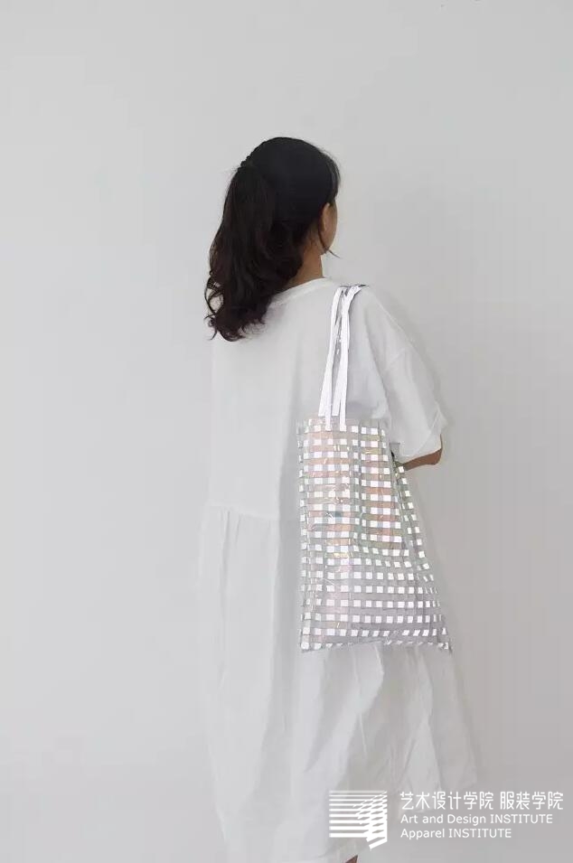 第三个是雨衣材质的单肩包,设计的灵感来源是通过对昆虫颜色特征以及生理体质特点的研究,运用反光面料进行面料再造,进一步丰富雨衣材质的安全性能,设计出一款材质特别的单肩包。