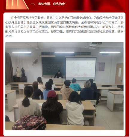 学生第二党支部在党史学习会议中通过《走进历史长河丨名句解读》和《以史载史,以史育人》系列推文,两个系列从不同角度进行学习党史。另外还有《回眸百年瞬间》等活动。活动结束后,各位同学对于党的历史有了更加深入的了解。