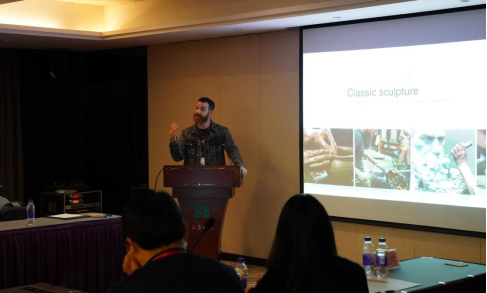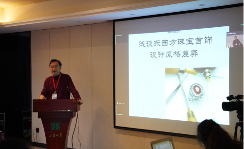 教授、浙江省省级专家王春刚以《浅谈东西方珠宝首饰设计风格差异》为题,分析了中国和美国的珠宝首饰设计的区别。中国的珠宝首饰设计经过了20余年的发展,突破了过去只注重传统纹样的方式,寻找到了一条具有东方文化、美学与时尚融合的设计风格。他结合一些具体的设计案例,指出了不同国家的设计是有差异的,中国的珠宝首饰设计要学习西方先进的设计理念与方法的同时,更要注重东方文化特色且追求高端性与创新性。他通过介绍G20峰会胸针设计,指出了在设计中融入文化元素、展现特色文化、实现民族情感认同的路径。