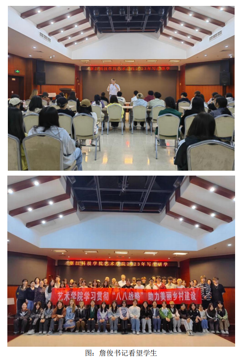 党委书记詹俊携新引进青年教师来看望同学们,了解课程实施情况。詹俊书记勉励同学们传承红色基因,厚植爱国情怀,弘扬时代精神;希望同学们能够认真学习,担当时代责任,助力美丽乡村建设。